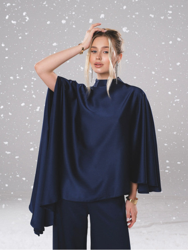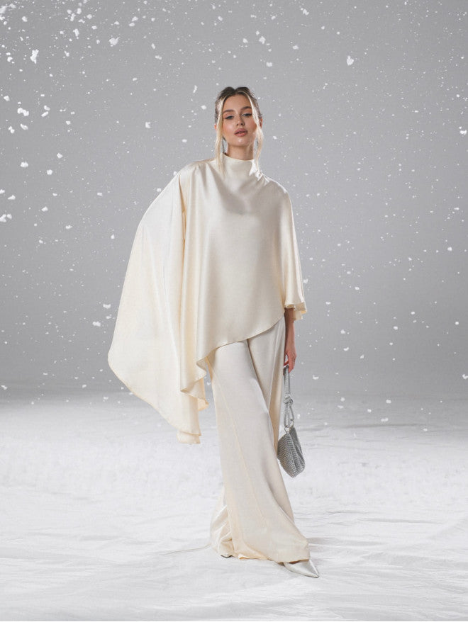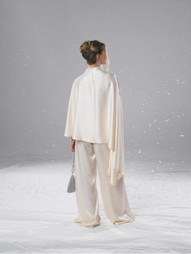 Asymmetrical cape-style cloak + draped trousers set