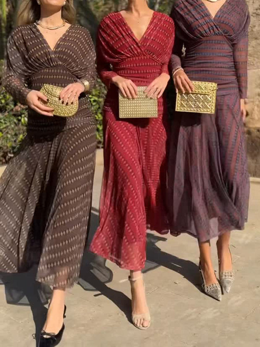 Elegant Printed Deep V Neck See-through Dress