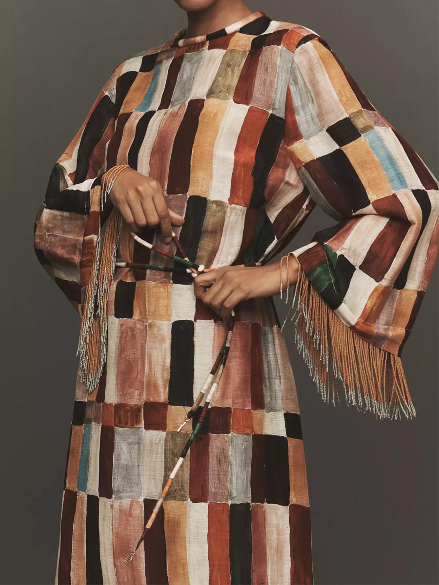 Tassel-Trim Cuff Printed Maxi Dress